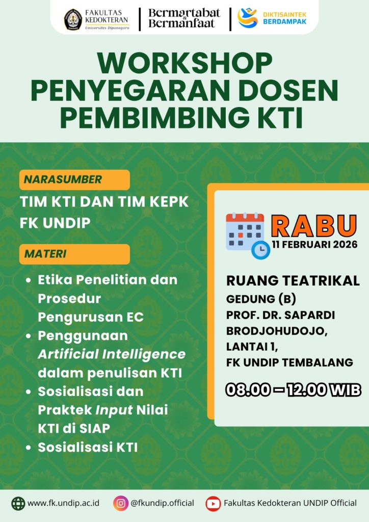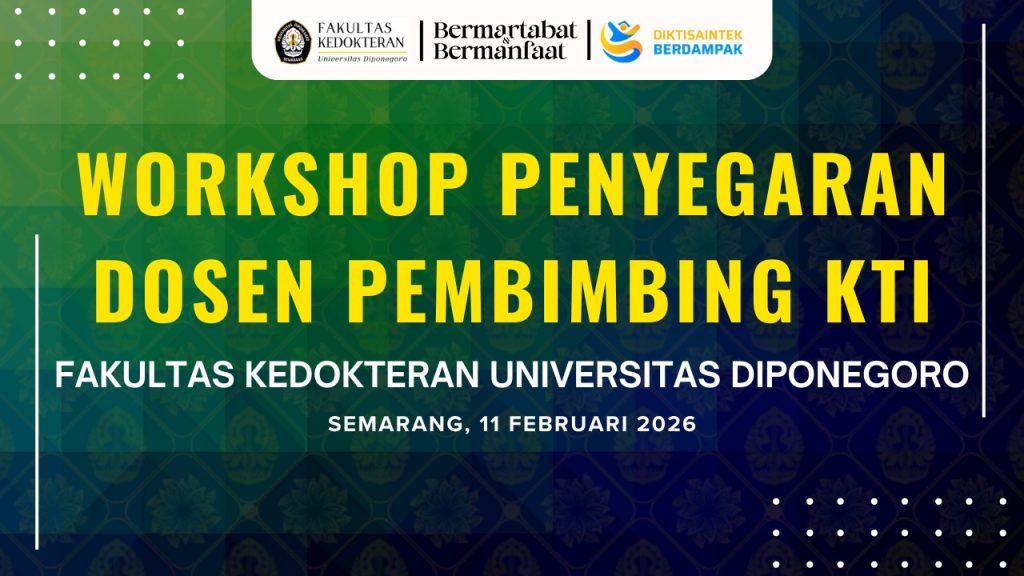 Semarang – Program Studi Kedokteran Fakultas Kedokteran Universitas Diponegoro (FK Undip) menyelenggarakan Workshop Penyegaran Dosen Pembimbing Karya Tulis Ilmiah (KTI) pada Rabu, 4 Februari 2026 di Ruang Teatrikal Gedung B FK Undip.